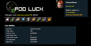 So how does gambling in EVE work? Well, there is no official gambling services in the game (unless you count investing in the market as gambling, it is, and the many other risky activities in EVE). This is actually something I would love to see. I had great hopes that the "Walking in Stations" feature would include some form of in-game casino. Well, Walking in Stations didn't happen and neither did in-game casino's, but there is an alternative created by the playerbase. This alternative is the EVE Online gambling website. It works by keeping track of your character and it's balance on the website. For example, to gamble on Evealopalous you register your character and then send "x" amount of ISK to the "Evealopalous" corporation. This ISK will appear under your characters balance on the website and you can then gamble with it. Almost all EVE gambling websites work this way.